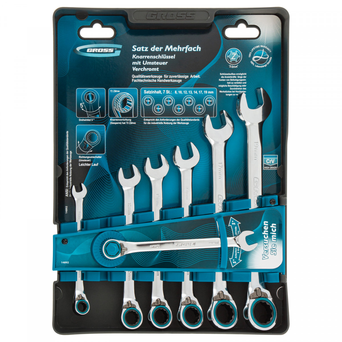 Набор ключей комбинированных с трещоткой, 8-19 мм, 7 шт, реверсивные, CrV Gross