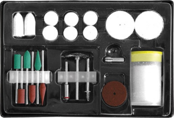 Предназначены для выполнения различных видов работ по дереву, металлу, пластику, стеклу с использованием гравера. Для гравировальной машинки. В наборе: фетровые насадки; штифт для фетровой насадки; резиновый полировочный круг; штифт для полировочного круга; зажимной патрон; мини корщётка-насадка тип «колесо» (стальная волнистая проволока); резиновые шарошки; полировочная паста. Упаковка: пластиковая коробка в блистере.