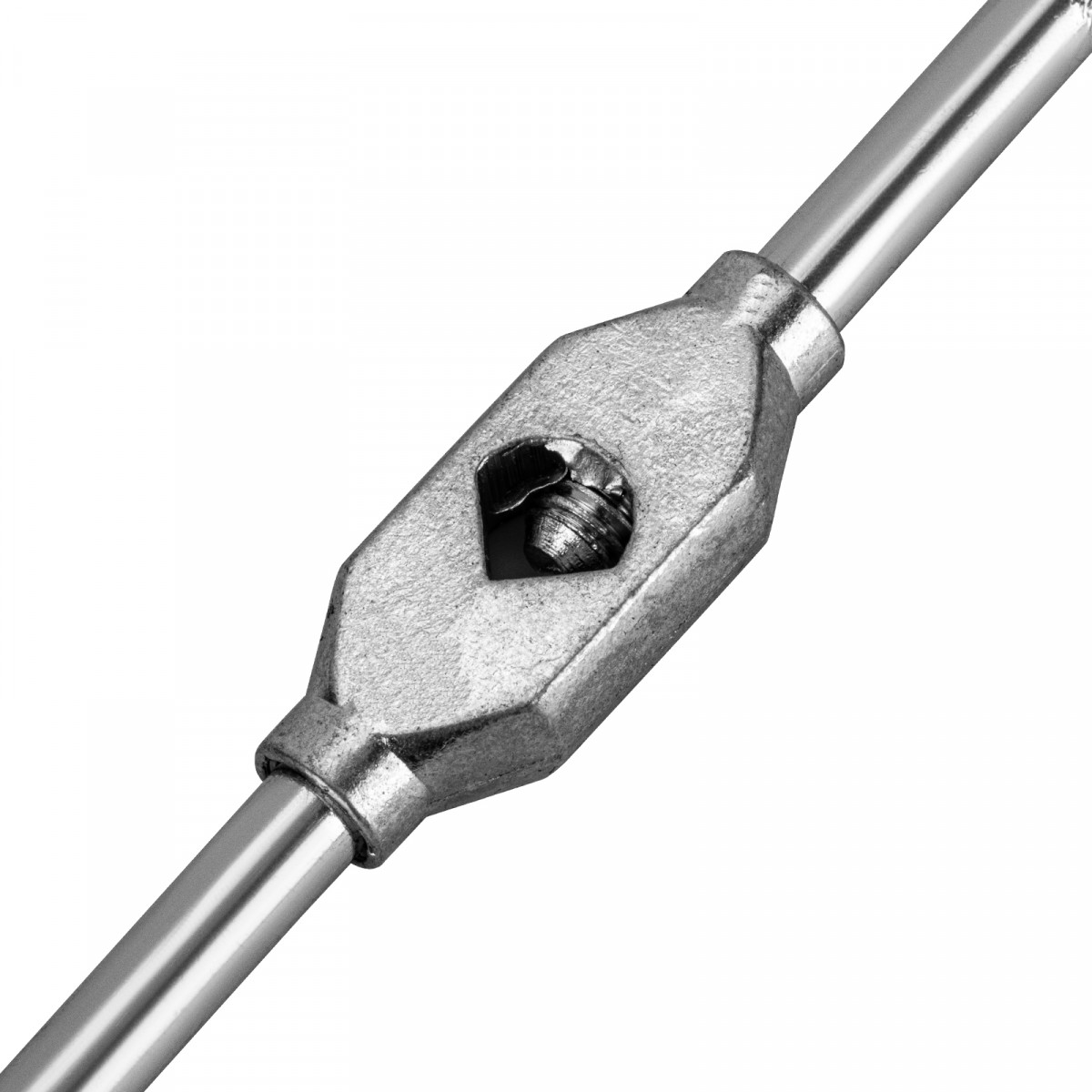 • Универсальный метчикодержатель — регулируемый винтовой механизм позволяет надежно фиксировать метчики с хвостовиками от 2,3 до 6,5 мм.