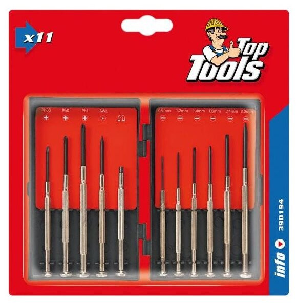 - Отвертки шлицевые: 0.9 x 23 мм, 1.2 x 23 мм, 1.4 x 24 мм, 1.8 x 24 мм, 2.4 x 25 мм, 3.0 x 29 мм;