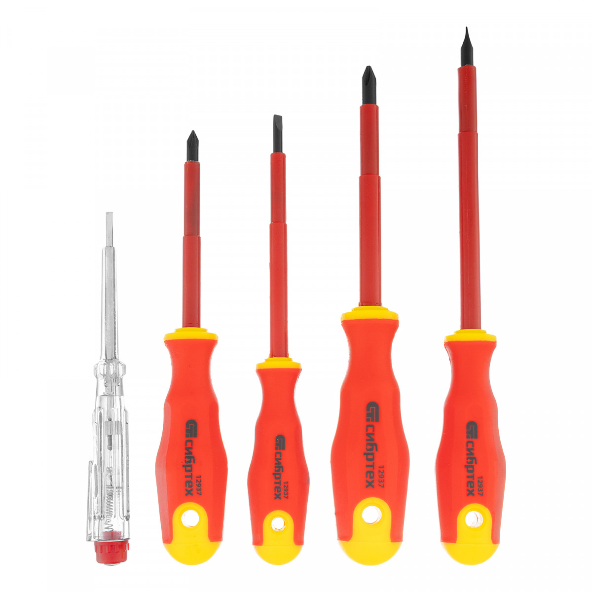 Набор отверток диэлектрических до 1000 В, 5 шт, тестер, CrV, двухкомпонентные рукоятки Сибртех