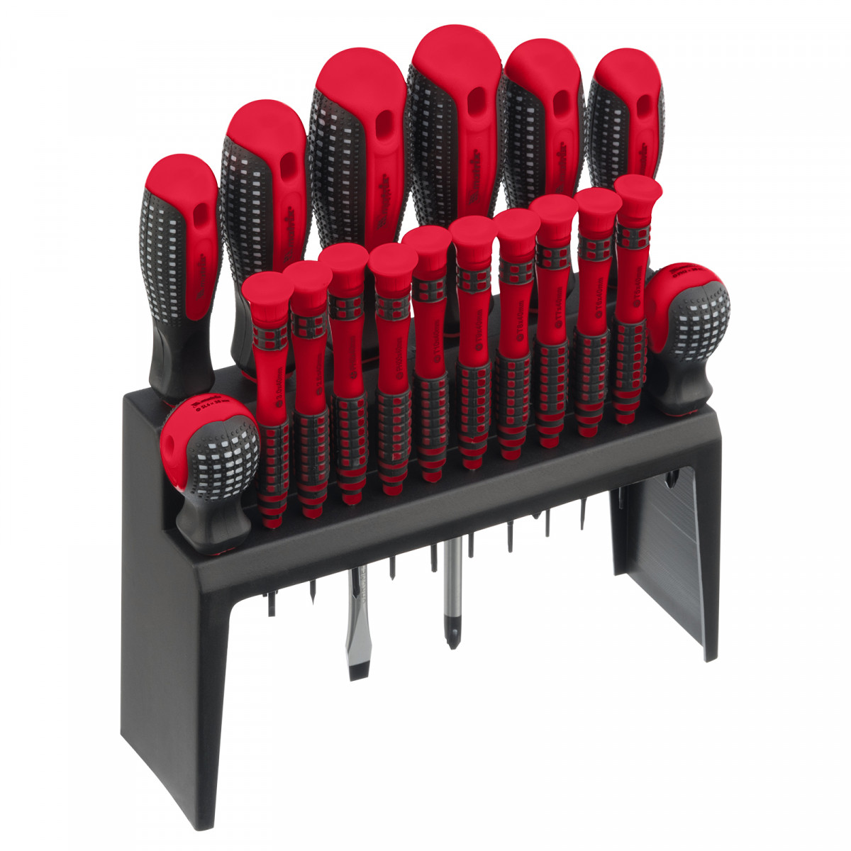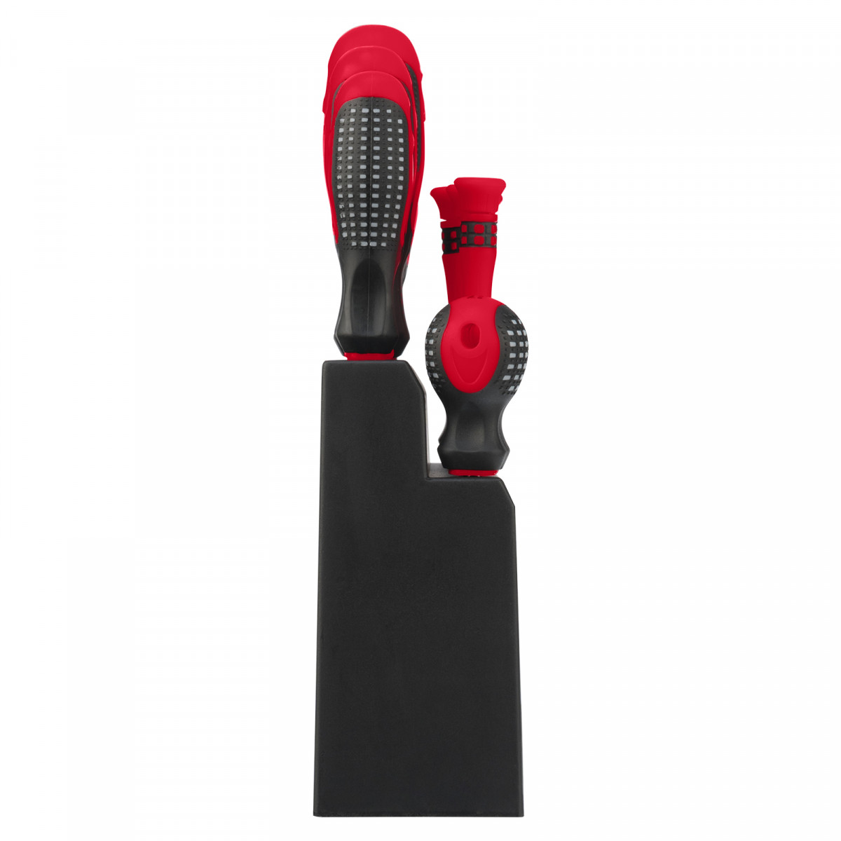 • Удобное хранение — отвертки размещаются на пластиковой подставке, которую можно поставить на стол или повесить на стену.