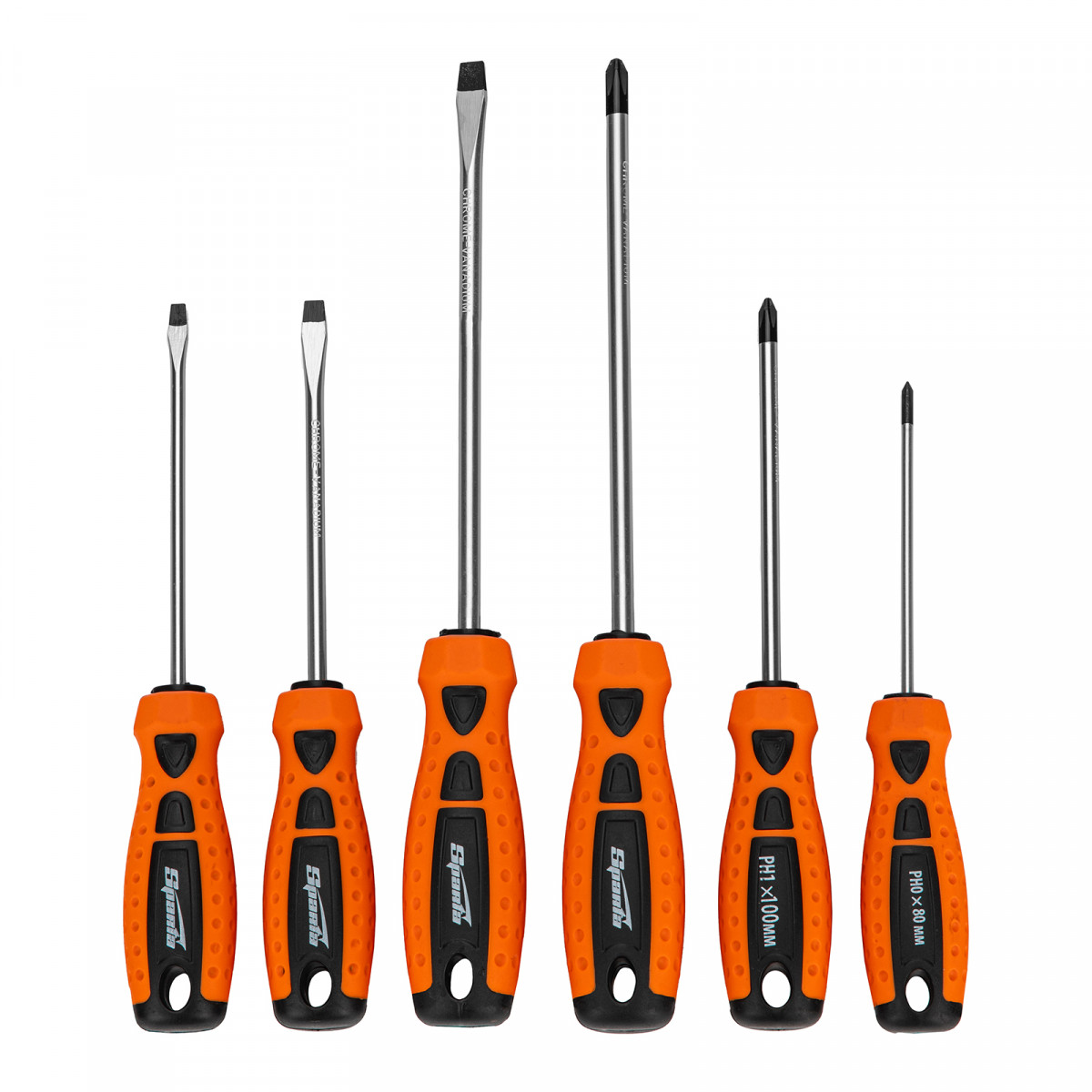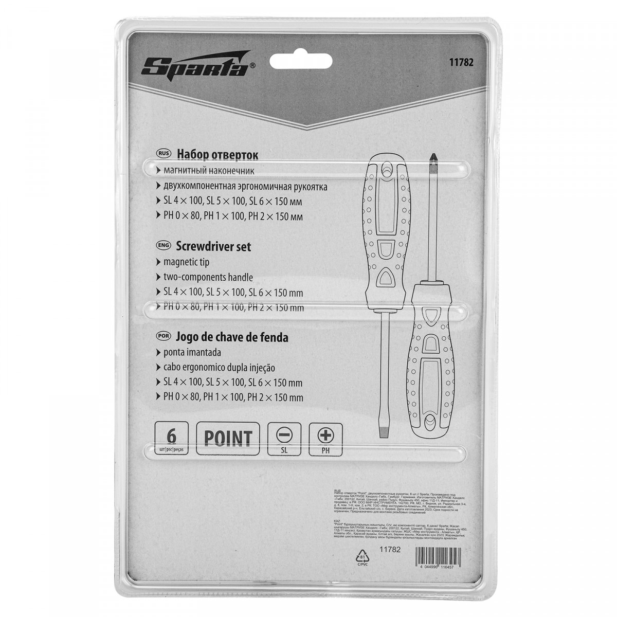 Набор отверток Sparta «Point» 11782 с двухкомпонентными рукоятками, CrV, состоит из 6 инструментов наиболее распространенных типоразмеров. Применяется для закручивания и откручивания крепежных элементов с профилем SL и PH. Набор рассчитан на бытовое использование, осуществление несложных монтажных и ремонтных работ. Отвертками можно работать в труднодоступных местах, т.к. комплект включает инструменты как с коротким — 75 мм, так и с длинным стержнем 150 мм.