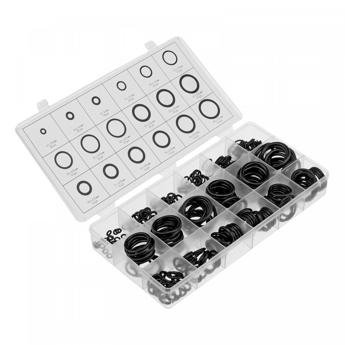 Пластиковый кейс - 1 штРезиновые уплотнители: 3х1,5 мм - 20 шт4,4х2 мм - 20 шт5х2 мм - 18 шт7х1,5 мм - 23 шт10х1,5 мм - 23 шт10х2,5 мм -14 шт11х2,5 мм -13 шт13х1,5 мм - 23 шт13х2,5 мм - 14 шт14х2,5 мм - 13 шт16х2,5 мм - 14 шт18х2