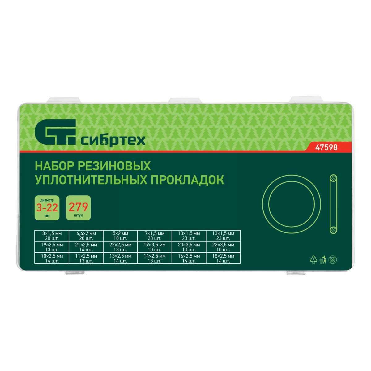 Набор Сибртех 47598 состоит из 279 резиновых уплотнительных прокладок с наружным диаметром от 3 до 23 мм и используется для создания герметичных конструкций. Позволяет решать широкий спектр задач, т. к. включает кольца наиболее часто встречающихся размеров. Прокладки используют для сантехнических и других ремонтных работ, а также в качестве уплотнительных резинок для автомобиля.