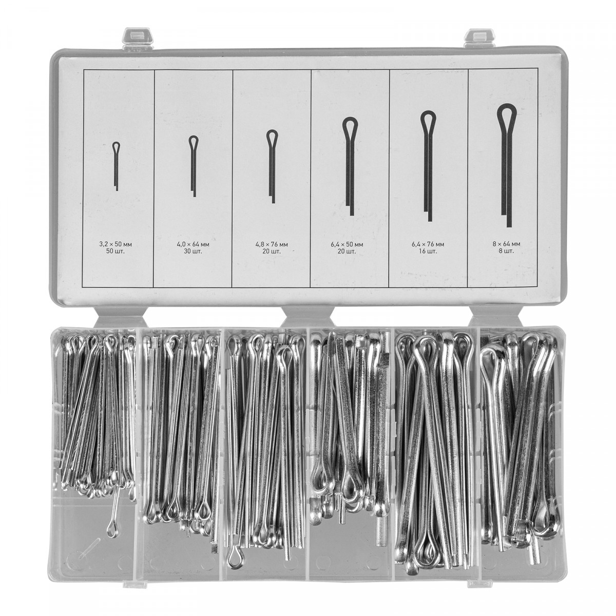 Набор шплинтов, S головки х L: 3.2 х 50.4 х 64, 4.8 х 76, 6, 4 х 25, 6, 4 х 76, 8 х 64 мм, 144 предмета Сибртех