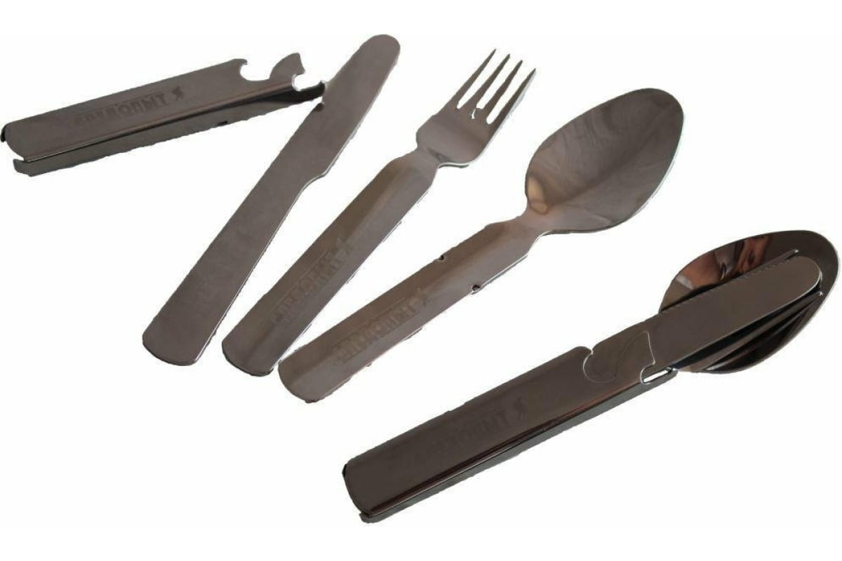 Набор столовых приборов в металлическом чехле Следопыт ложка, вилка, нож, открывашка PF-CWS-P59 пригодится в походе или на пикнике.Приборы, входящие в набор, выполнены из нержавеющей пищевой стали, не вступающей в реакции окисления с продуктами питания, что гарантирует длительный срок службы.