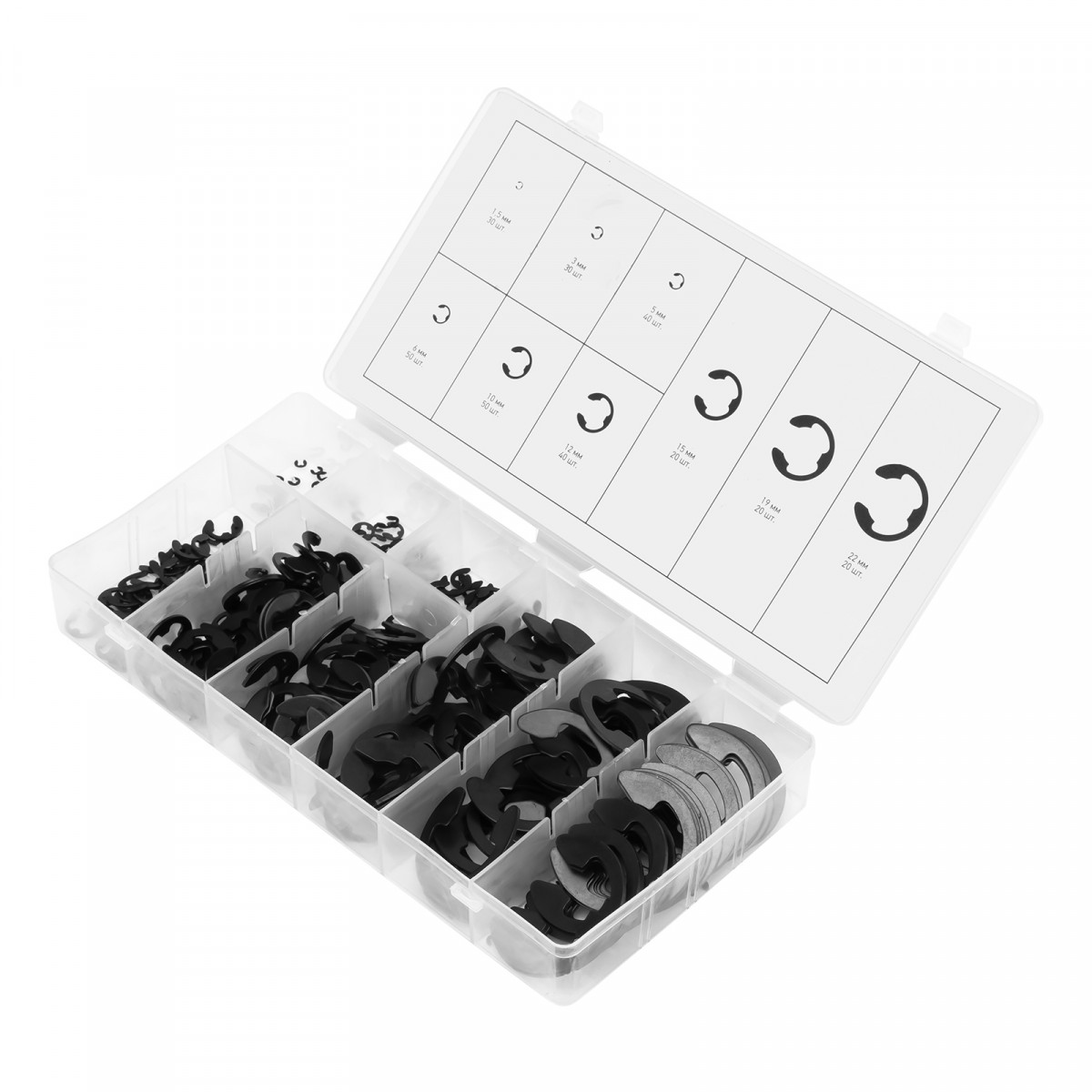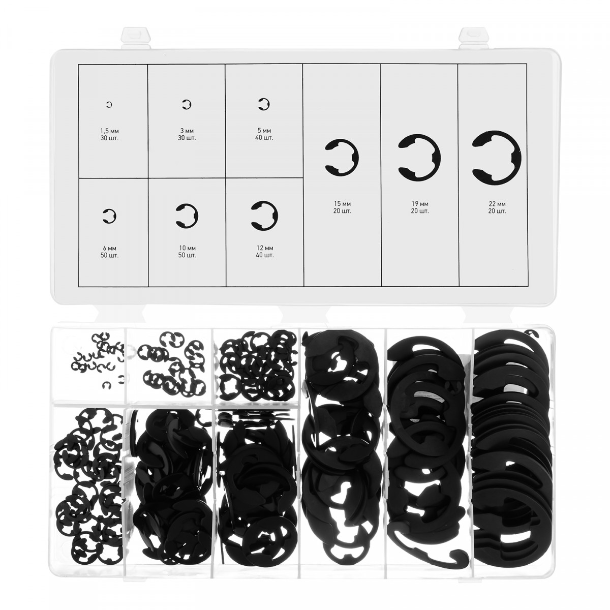 Пластиковый кейс- 1 штСтопорные кольца: 1,5 мм - 30 шт3 мм - 30 шт5 мм - 40 шт6 мм - 50 шт10 мм - 50 шт12 мм - 40 шт15 мм - 20 шт19 мм - 20 шт22 мм - 20 шт