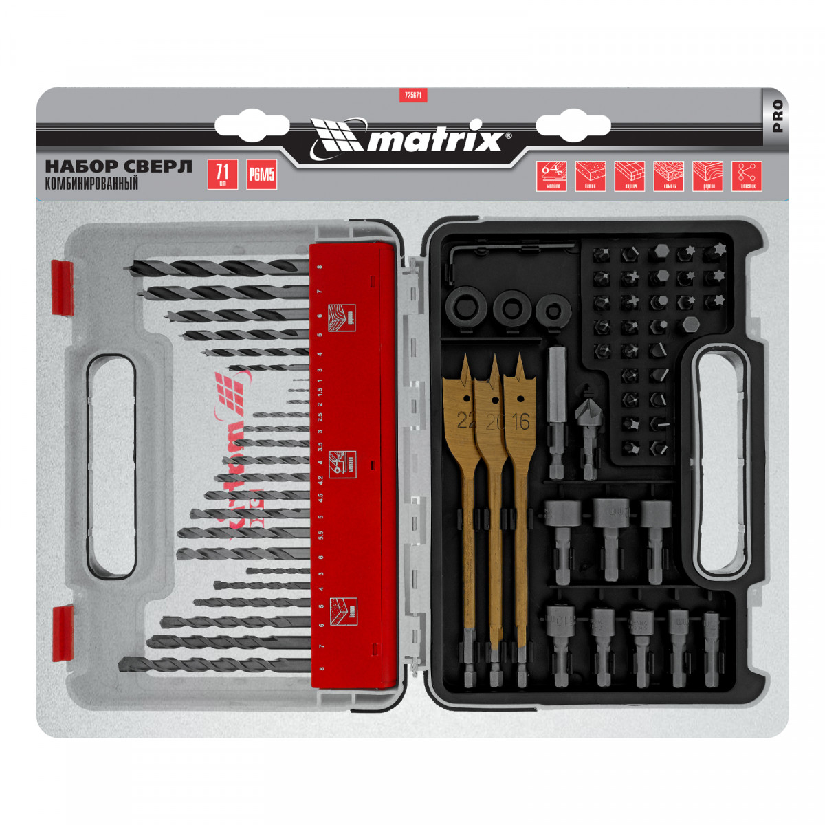 Комбинированный набор Matrix PRO 725671 — универсальное решение для мастеров, т. к. он содержит 71 предмет: отверточные биты (30 шт.) и адаптер к ним, шестигранный ключ, зенковку, стопорные кольца, 8 торцевых головок, 3 перовых сверла, сверла по дереву 3-8 мм, сверла по бетону 3-8 мм и сверла по металлу 1-6 мм. Оснастка подходит как для бытового использования, так и решения профессиональных задач.