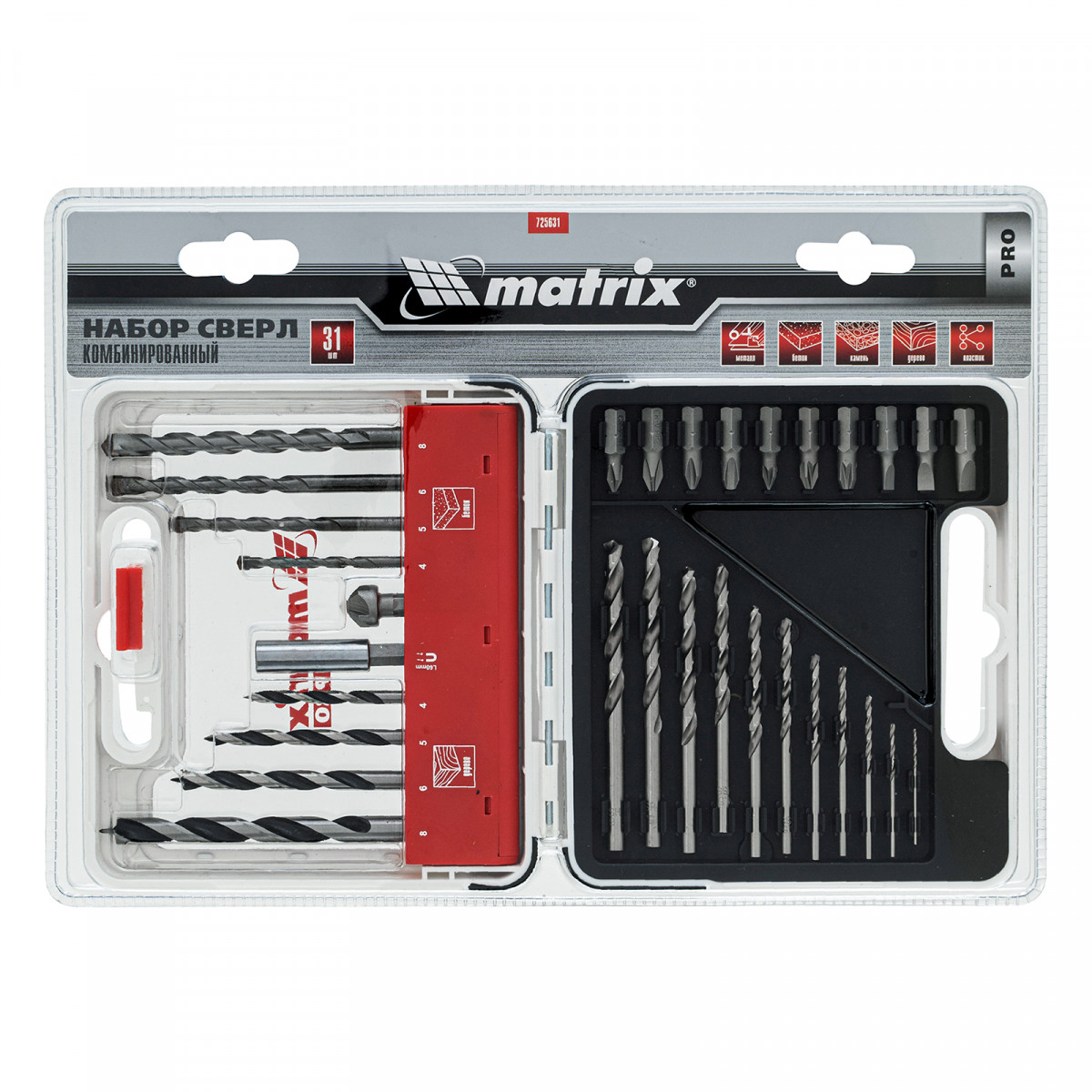 Комбинированный набор Matrix PRO 725631 — универсальное решение для мастеров, т. к. он содержит 31 предмет: отверточные биты (10 штук) и адаптер к ним, зенковку и сверла по дереву 4-8 мм, сверла по бетону 4-8 мм и сверла по металлу 1-6 мм. Оснастка подходит как для бытового использования, так и решения профессиональных задач.