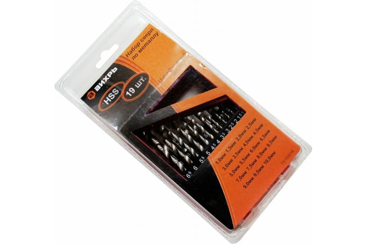 Набор сверл по металлу,1-10мм (через 0,5мм),HSS, 19шт.,металл.коробка,цилиндрический хвостовик ВИХРЬ