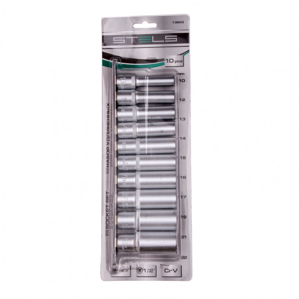 Набор удлиненных торцевых головок 1/2", шестигранные, CrV, 10 шт, 10-22 мм Stels