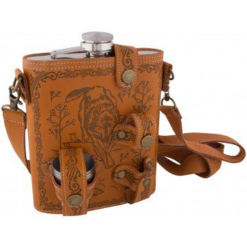 Подарочный набор "Волк" в кожаном чехле. Фляжка и стопки изготовлены из нержавеющей стали. На чехол сверху нанесена красочная картинка.• 1 фляжка 500 мл;