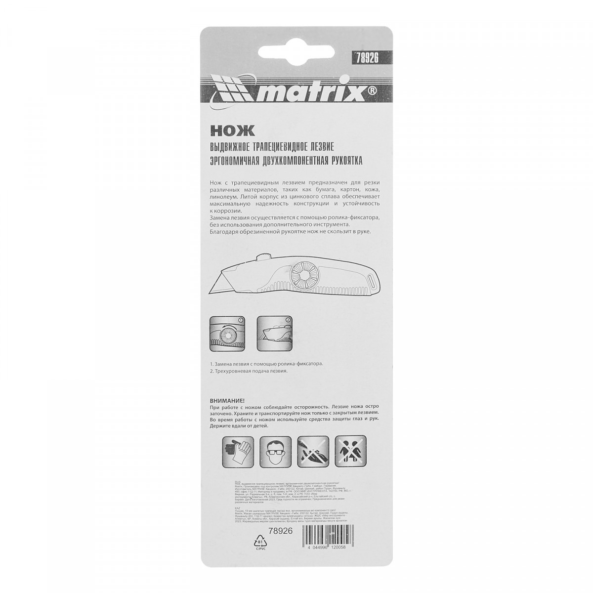 Нож Matrix 78926 с выдвижным трапециевидным лезвием и эргономичной двухкомпонентной рукояткой эффективно справляется с резкой бумаги, картона, кожи и других нетвердых материалов. Он станет незаменимым помощником на строительной площадке, на кухне, в офисе. Складная конструкция инструмента делает его универсальным, а также повышает удобство и безопасность эксплуатации.