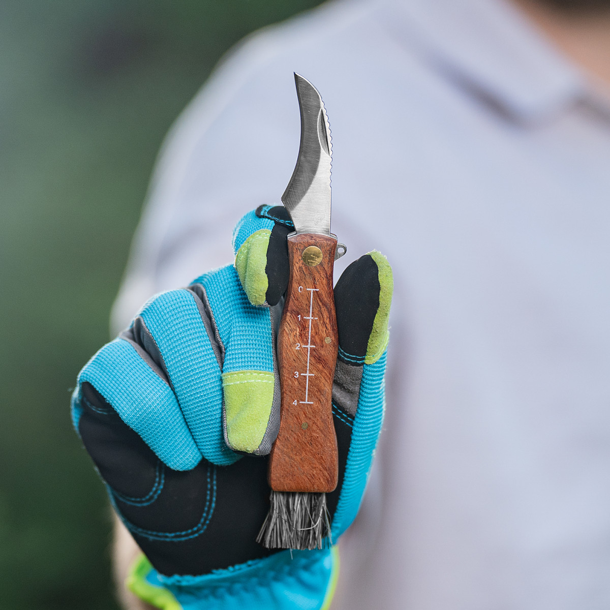 • Специальные зазубрины на верхней кромке лезвия помогают очистить ножки грибов от земли и грязи.