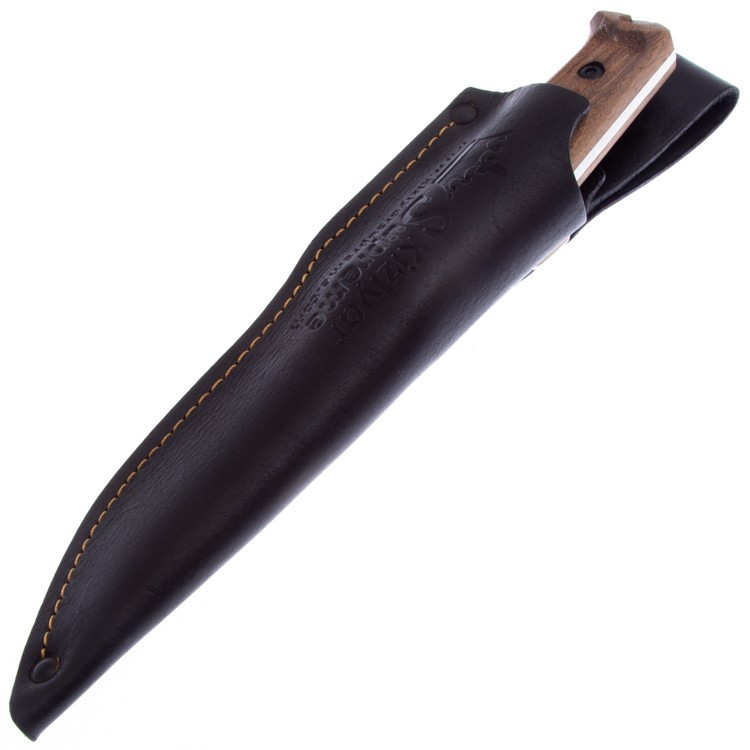 Рукоять выполнена из стабилизированной древесины ореха. Дерево является одним из самых традиционных и распространенных материалов для рукоятей ножей. Основным плюсом древесины является то, что, благодаря своей текстуре, она позволяет без особых усилий практически любую художественную форму рукояти. Традиционно используется на охотничьих ножах.