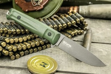 Sturm с клинком из стали PGK. Очень высокая твердость 62-63 HRC - мечта любого пользователя - нож отлично держит заточку. Однако, обычно при такой твердости клинки становятся хрупкими. Только не со сталью PGK! Не имеющая аналогов, эта немецкая сталь выдерживает весьма высокие нагрузки даже при такой высокой твердости. Благодаря большому содержанию легирующих элементов (углерод, вольфрам, ванадий, молибден, кремний), данная сталь отличается агрессивным резом и высочайшей износостойкостью, то есть отлично держит остроту кромки. При этом клинки весьма прочны и устойчивы к сколам даже на высокой твердости порядка 62-63 HRC. Если вы хотите совместить отличный рез, удержание заточки и высочайшую прочность – можно смело выбирать клинок из PGK. Из-за высокой твердости сталь с такой высокой износостойкостью точится довольно тяжело, однако при наличии алмазных брусков или водных камней проблем не возникнет. 8.5% хрома в составе дают стали PGK определенную стойкость к коррозии, но нержавеющей ее не назвать. Могут поя