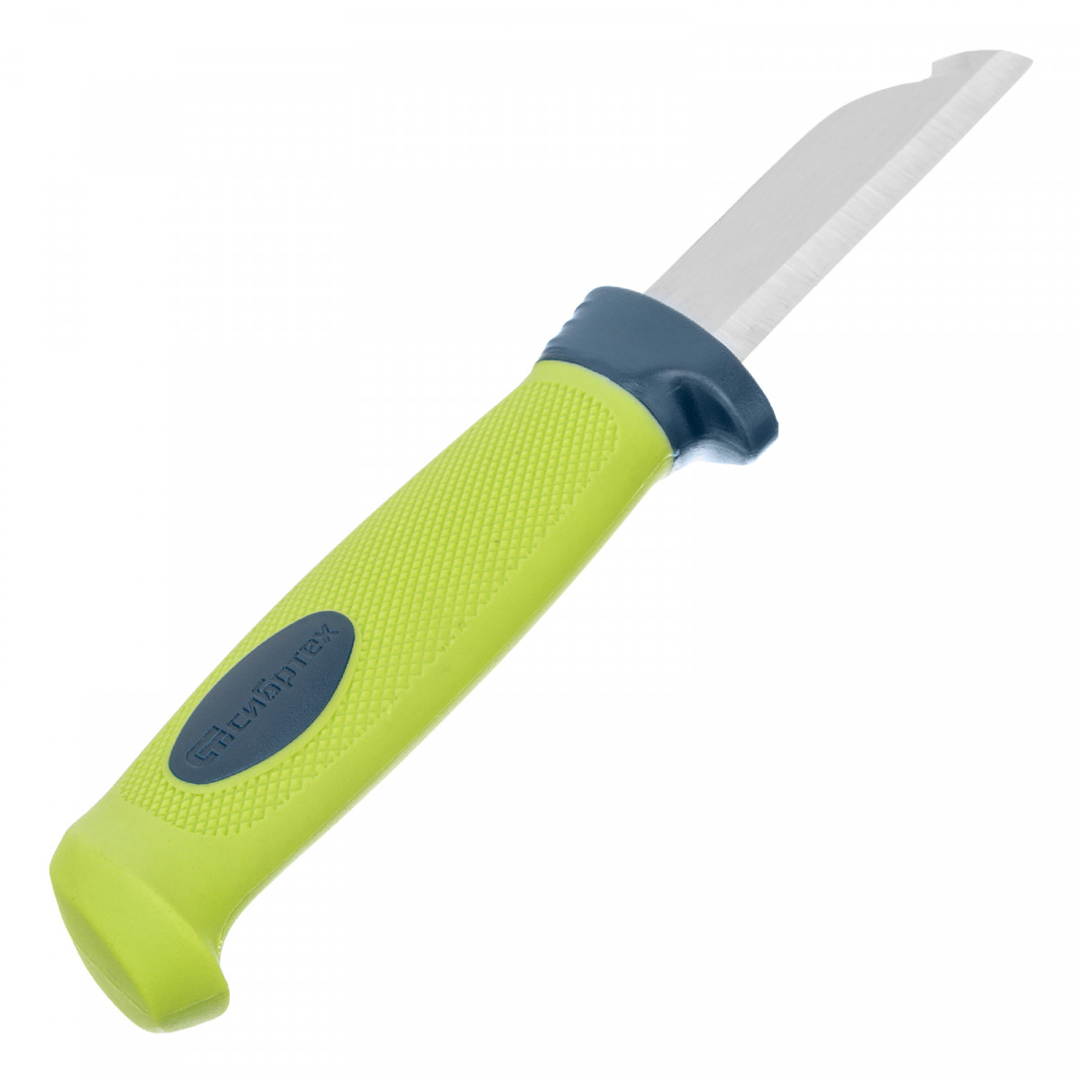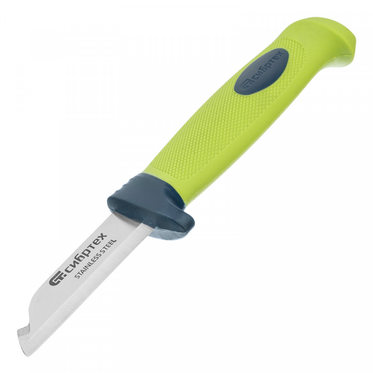 Нож монтажника Сибртех 79012 общей длиной 190 мм и длиной лезвия 67 мм, с чехлом и обрезиненной рукояткой, предназначен для работ с проводкой. С его помощью можно зачистить и обрезать кабель. Нож с пластиковым чехлом безопасен при транспортировке, поэтому его удобно брать с собой на выездные работы.