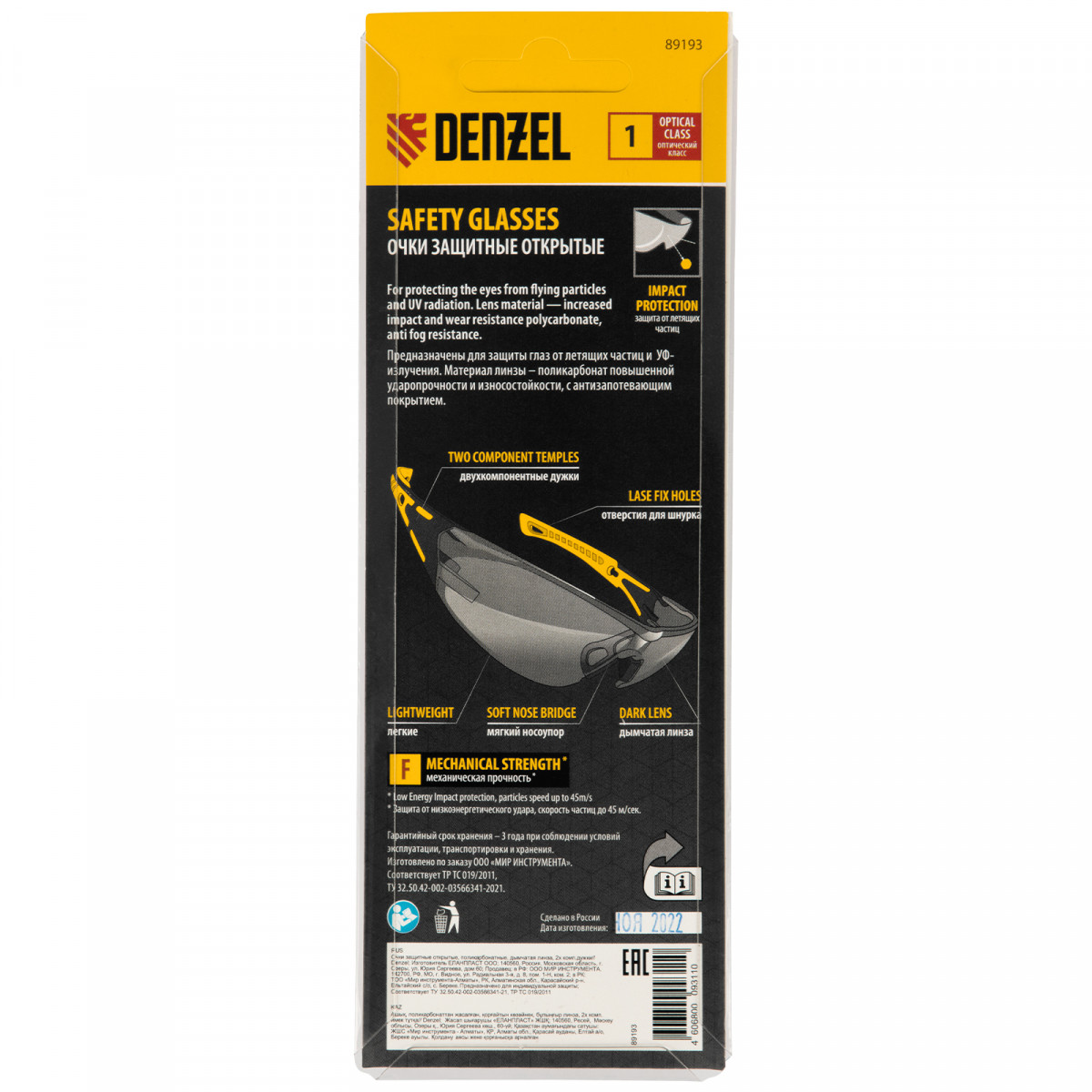 Легкие универсальные защитные очки открытого типа Denzel 89193 с поликарбонатными дымчатыми линзами и 2-компонентными дужками предназначены для защиты глаз от механических повреждений и УФ-излучения. Очкам присвоен класс механической прочности F, они обеспечивают защиту от высокоскоростных частиц с низкоэнергетическим ударом V=45 м/с. Очки используются во время работы с электро- и бензоинструментом, на производстве и в быту.