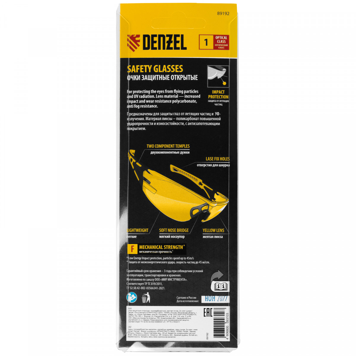 Легкие универсальные защитные очки открытого типа Denzel 89192 с поликарбонатными желтыми линзами и 2-компонентными дужками предназначены для защиты глаз от механических повреждений и УФ-излучения. Очкам присвоен класс механической прочности F, они обеспечивают защиту от высокоскоростных частиц с низкоэнергетическим ударом V=45 м/с. Очки используются во время работы с электро- и бензоинструментом, на производстве и в быту.