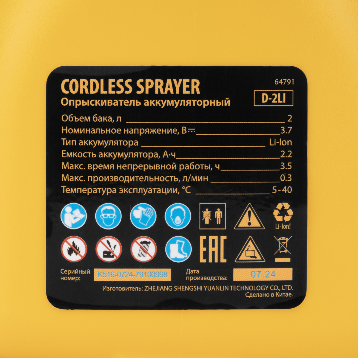 Опрыскиватель аккумуляторный D-2LI, 2 л, 3,7 В, 2,2 Ач Denzel