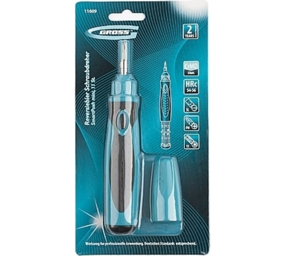 Реверсивная отвертка GROSS с механизмом SmartPush mini, 11 шт. 11609 предназначена для работ с мелким крепежом. Имеет битодержатель и намагниченные биты из профессиональной CrMo стали. Благодаря эргономичной рукоятке инструмент удобно лежит в руке. Механизм SmartPush служит для вытаскивания битодержателя из скрытой полости внутри рукоятки.