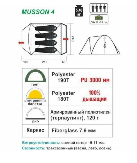 Helios Палатка MUSSON 4 (Helios) - удобная 4-местная палатка с вместительным тамбуром, сформированным отдельной дугой. В тамбуре поместится большое количество снаряжения. Тент палатки имеет 2-слойную структуру и оснащен 2 широкими входами. Вентиляционные клапаны с 2 сторон обеспечат комфортный микроклимат в палатке. Антмоскитная сетка. Все швы проклеены. Материал тента: полиэстер. Материал каркаса: стеклопластик. Диаметр дуг: 7.9мм.