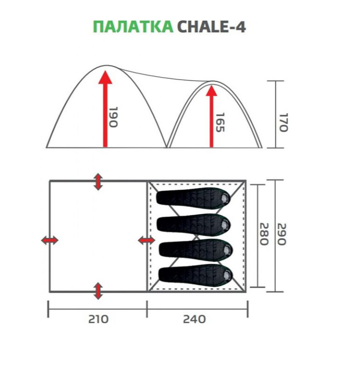 Палатка – двухслойная (внутренняя палатка и внешний тент).Размеры внешнего тента: (210+240)×290×190/170 см.