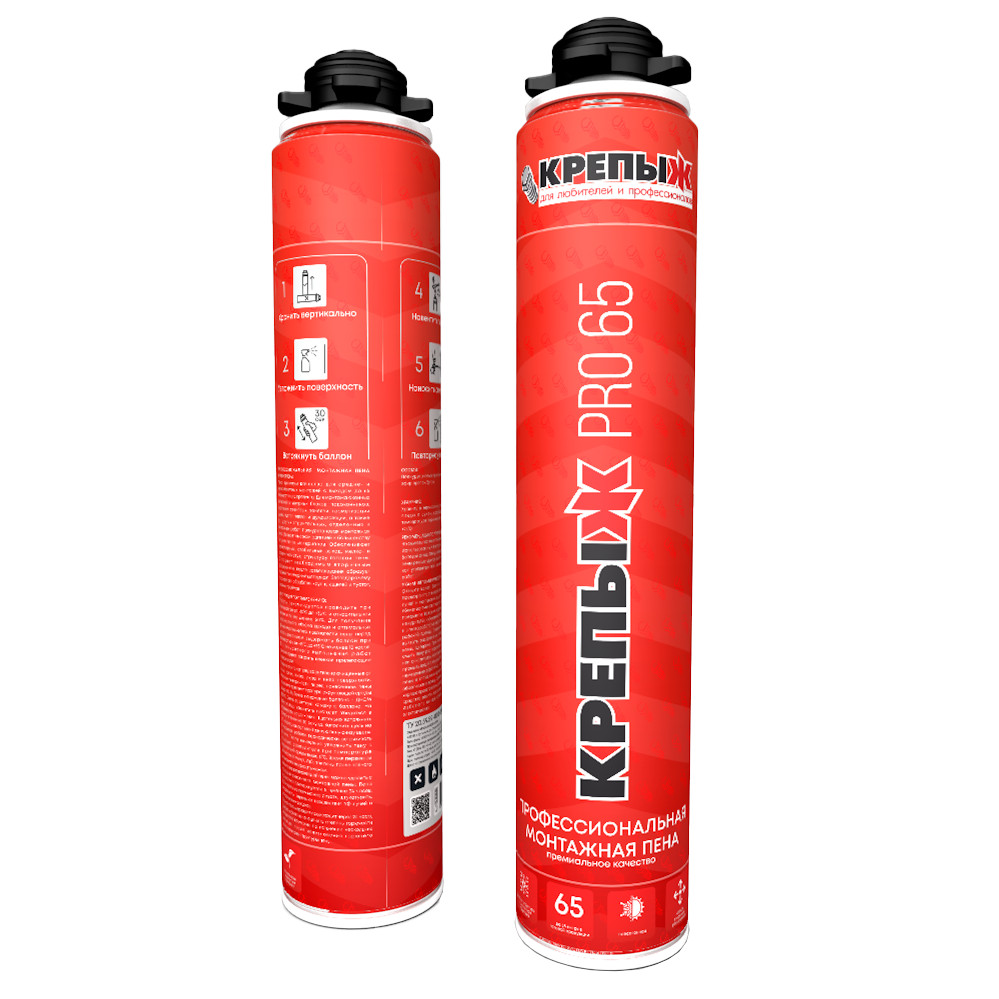 ПРОФЕССИОНАЛЬНАЯ МОНТАЖНАЯ ПЕНА PRO-65 (под пистолет для монтажной пены), пена премиум качества для средне- и мелко- объёмных монтажей с выходом до 65 литров готового продукта. Для монтажа оконных витражей и дверных блоков, подоконников, крепления стеновых панелей, герметизации щелей , пустот, тепло - и шумоизоляции, а также для других строительных , отделочных и монтажных работ. Полиуретановая монтажная пена обладает высокой адгезией к большинству строительных материалов. Обеспечивает равномерный, стабильный выход, мелко- и среднепористую структуру готовой пены. Обладает необходимым вторичным расширением, после затвердевания образует прочный полимерный материал, благодаря чему подходит для обработки крупных щелей и пустот, оконных проёмов.