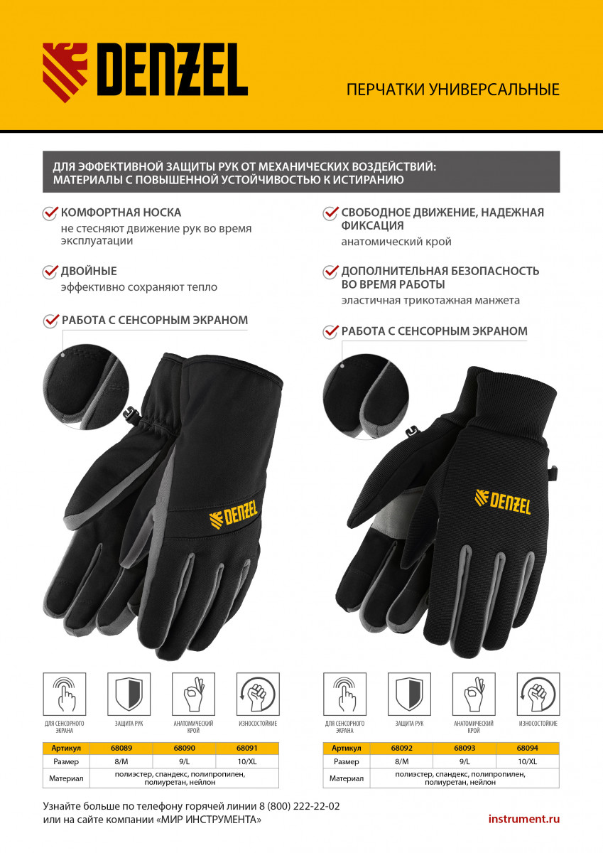"Перчатки Denzel 68090 обеспечивают комфортную работу с сенсорным экраном благодаря специальным накладкам."