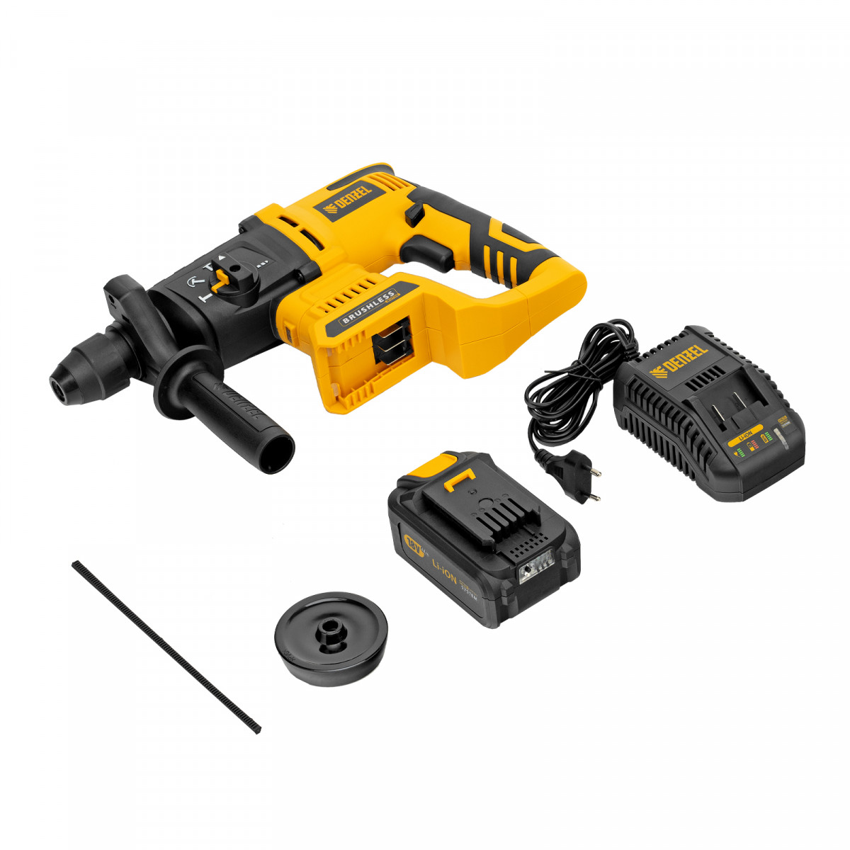 • Полная комплектация — к инструменту прилагается аккумулятор емкостью 4 Ач, зарядное устройство, дополнительная рукоятка и ограничитель глубины сверления.