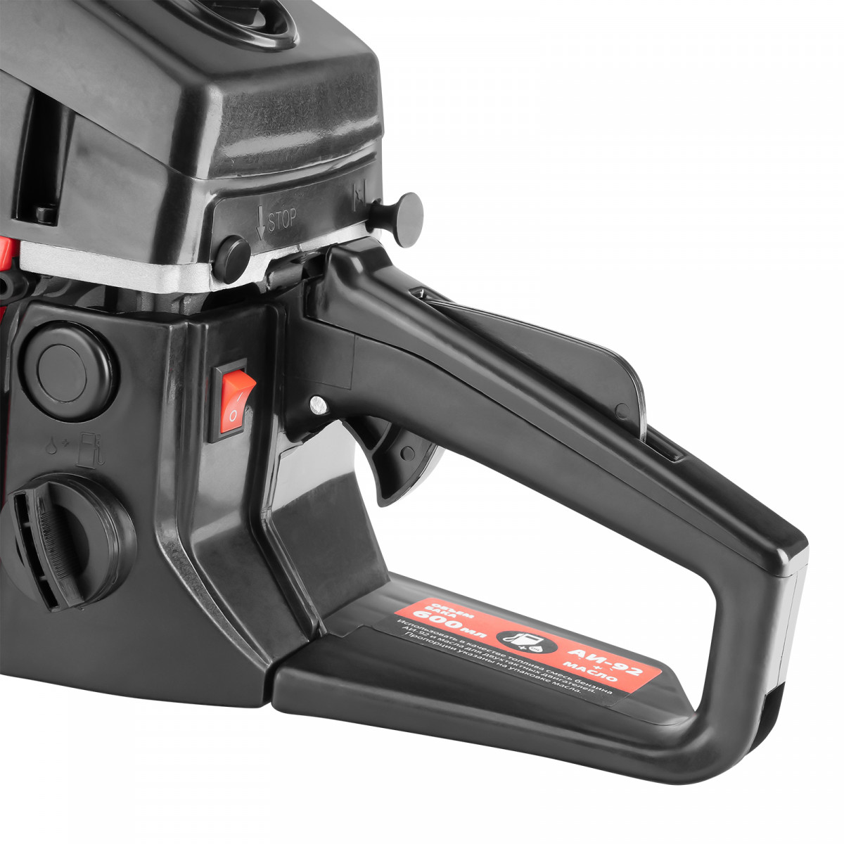 • Безопасная эксплуатация — функция блокировки газа предотвращает случайный запуск, тормоз цепи снижает риск травмирования при отскоке пилы.