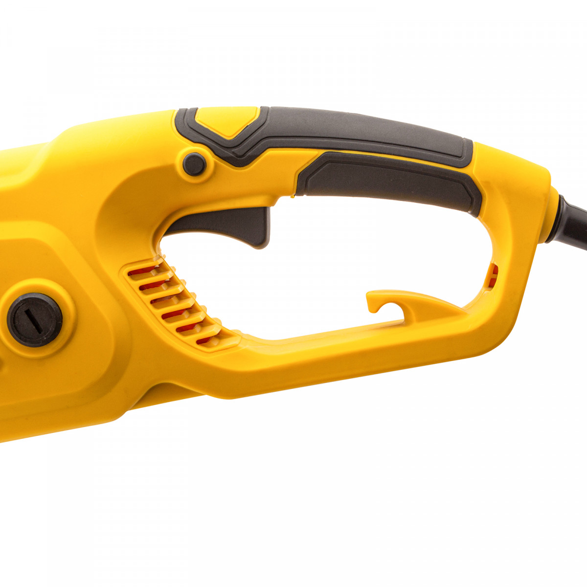 • Блокиратор пуска — дети или посторонние лица не смогут случайно включить пилу, нажав на основной выключатель (запуск возможен только при одновременном удержании выключателя и кнопки блокировки).