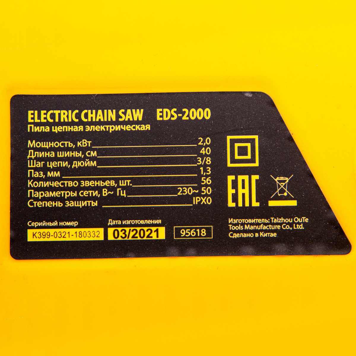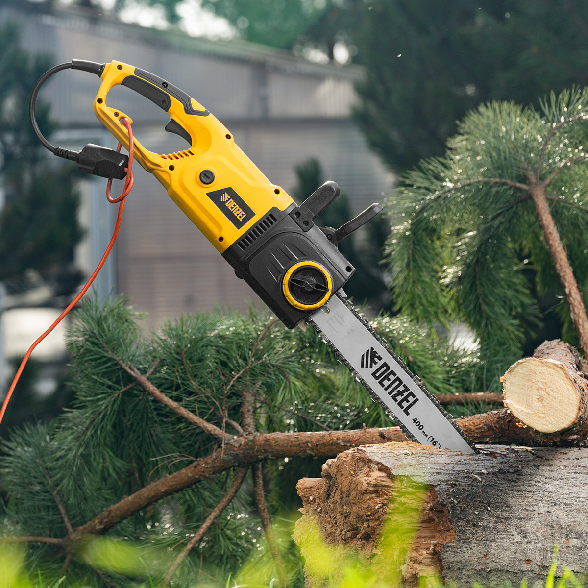 Пила цепная электрическая EDS-2000, 2 кВт,продольная, шина 40 см, шаг 3/8, паз 1.3 мм, 56 звеньев Denzel