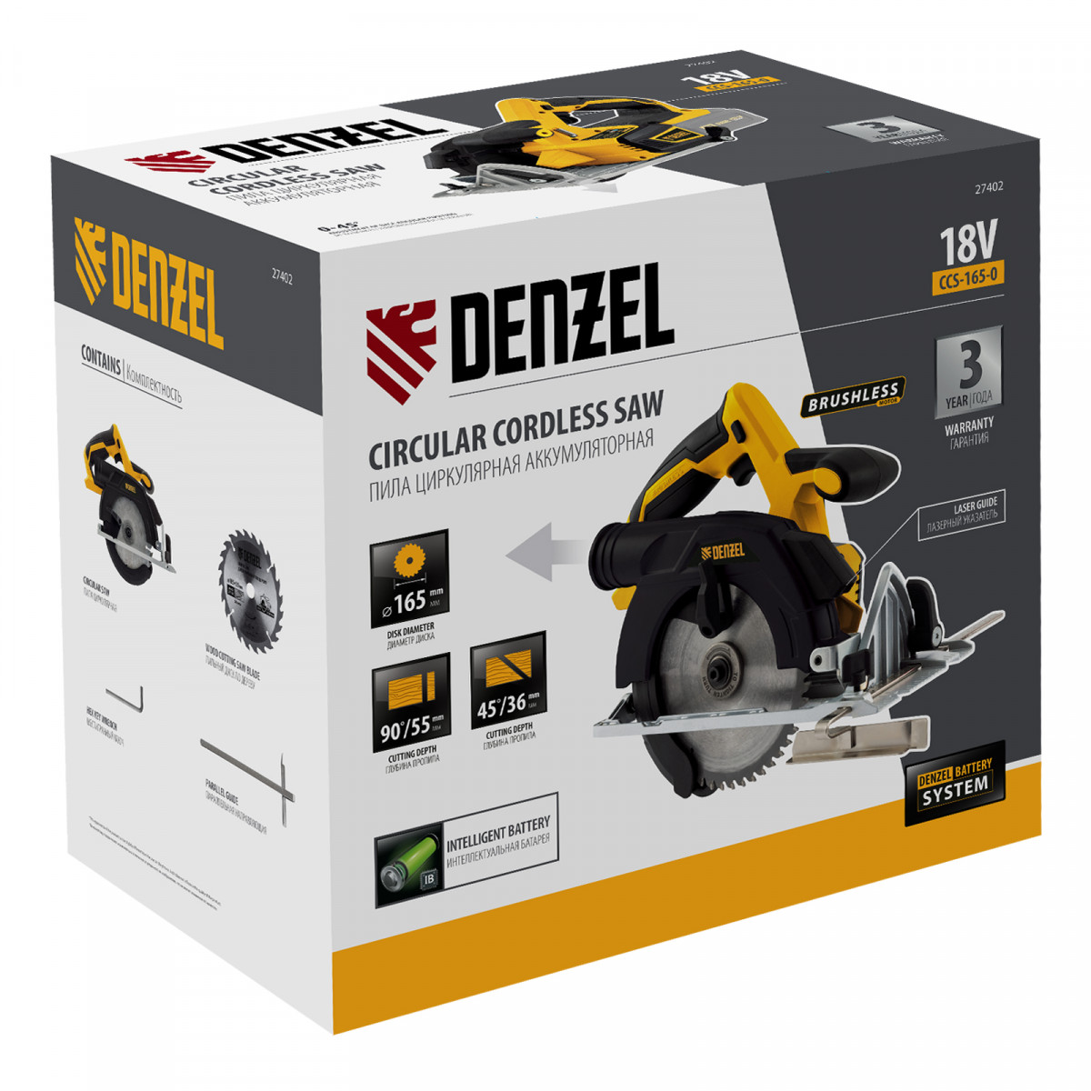 Пила циркулярная аккумуляторная бесщет. CCS-165-0, 18В Li-Ion Denzel