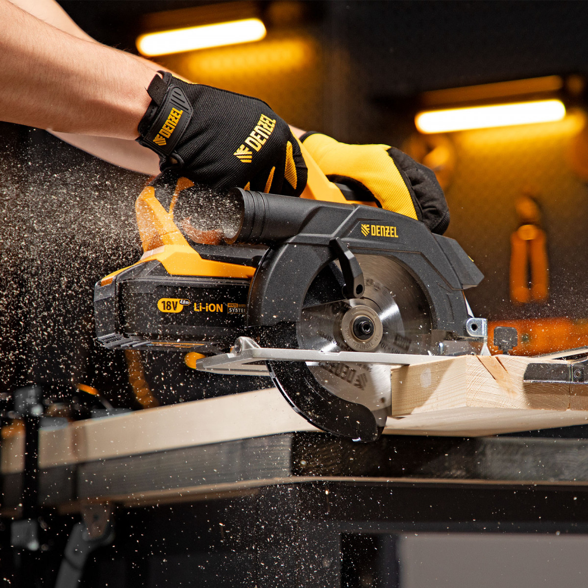 Пила поставляется без АКБ и зарядного устройства, для ее питания подойдет универсальный аккумулятор емкостью 4 А·ч, совместимый с любым инструментом, работающим на единой аккумуляторной платформе Denzel battery system 18V.
