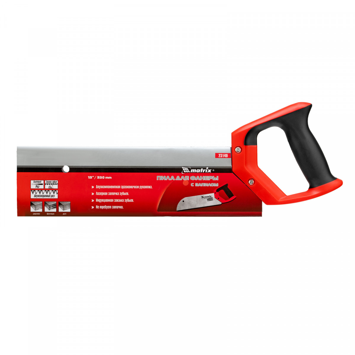 Пила для фанеры с запилом Matrix 23149 с полотном длиной 330 мм и двухкомпонентной рукояткой, позволяет производить распил древесины, фанеры, ДСП в продольном и поперечном направлении. Ей можно пилить как от себя, так и на себя. Благодаря лазерной заточке зубьев распиловка происходит легко, без нажима на поверхность заготовки. Запил в передней части полотна упрощает работу. Мелкие зубья с шагом 2 мм обеспечивают ровный и гладкий рез. Пила будет полезна в столярной мастерской, пригодится также и в домашнем хозяйстве.