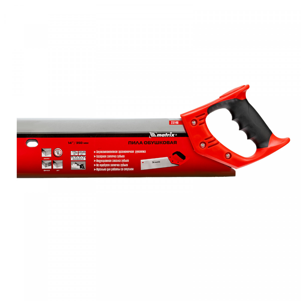 Обушковая пила по дереву для стусла Matrix 23148 с полотном длиной 350 мм и двухкомпонентной рукояткой, используется для продольно-поперечного пиления древесины, фанеры, ДСП. Ребро жесткости не дает полотну изгибаться, поэтому ножовкой удобно производить распил под углом — например, при работе со стуслом. Шаг зубьев составляет 2 мм, что обеспечивает чистый и ровный рез. Пила пригодится при проведении столярных работ дома или в мастерской.