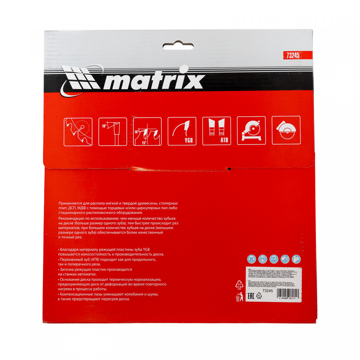 Пильный диск по дереву Matrix 73245 диаметром 255 х 32 мм, с 96 зубьями и переходным кольцом 32/30, — оснастка для циркулярных и торцовочных пил с соответствующим посадочным и внешним диаметром. Используется преимущественно для поперечного реза материалов из мягкой и твердой древесины, ДСП, ДВП, фанеры, столярных плит. В комплект поставки входит переходное кольцо 32/30, позволяющее самостоятельно изменить посадочный диаметр при необходимости. Диск подходит для бытового и профессионального применения.