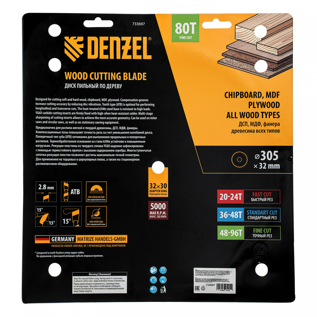 Пильный диск Denzel 733697 диаметром 305 x 32 мм, с 80 зубьями, предназначен для точного продольного и поперечного распила твердой и мягкой древесины, фанеры, МДФ, ДСП. 80 зубьев типа ATB с режущими пластинами оптимальной геометрии обеспечивают максимально чистый рез. Режущие пластины из твердого сплава YG6X сохраняют рабочие свойства при интенсивном использовании. Диск устанавливается на циркулярную, торцовочную пилу или на распиловочный станок. В комплект поставки входит переходное кольцо с 32 на 30 мм, что позволяет изменить посадочный размер и расширяет возможности использования диска.