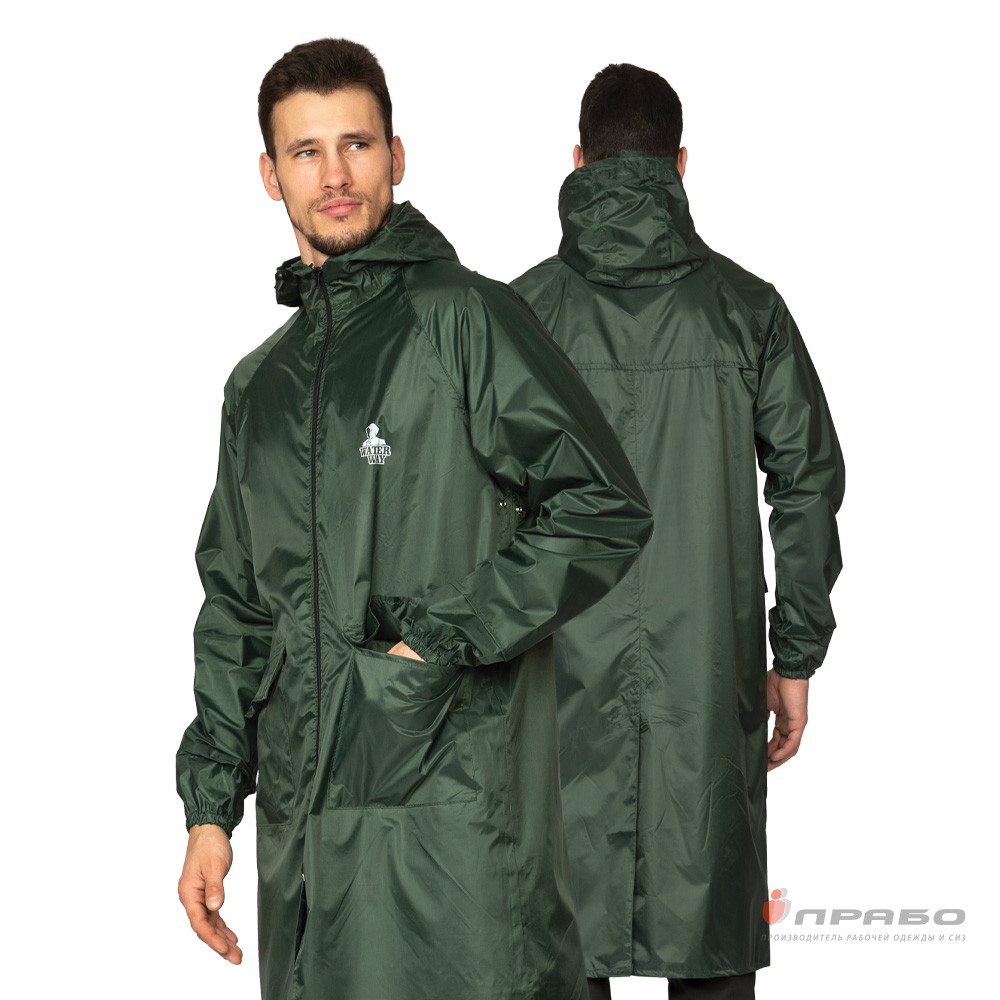 Влагозащитный плащ прямого силуэта, с рукавами реглан, с притачным капюшоном, с центральной застежкой на молнию, с внутренней ветрозащитной планкой под молнию.