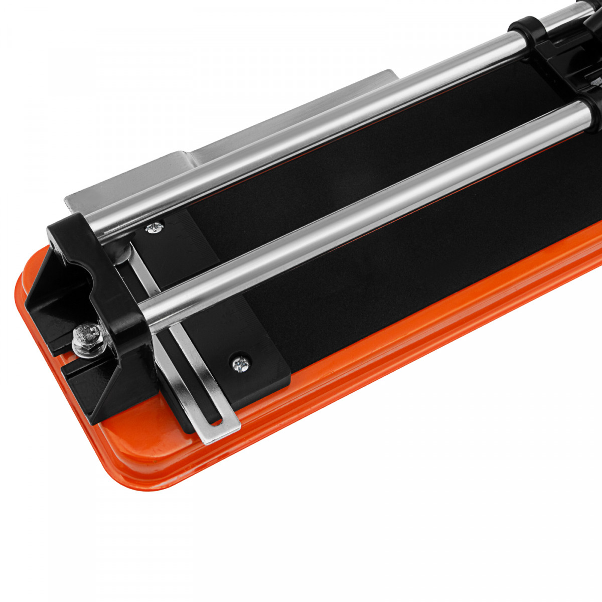 • Точность выполняемых работ — металлическая линейка-угольник облегчает позиционирование плитки на станине, твердосплавный режущий ролик обеспечивает аккуратный рез.