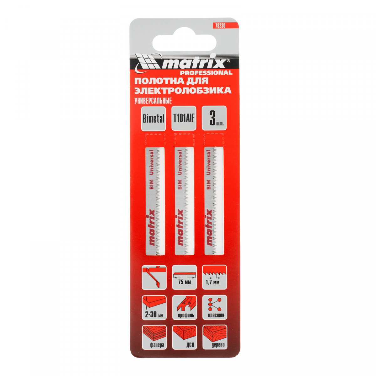 Полотна для электролобзика T101AIF Matrix 78230, биметаллические (Bimetal), с рабочей длиной 72 мм и шагом зубьев 1,7 мм, 3 шт. в упаковке, предназначены для выполнения работ по дереву толщиной 2-30 мм с покрытием, а также для распиловки ламината, полимерных и эпоксидных материалов. Имеют Т-образный хвостовик, поэтому совместимы с большинством современных электролобзиков. Пилки будут полезны во время ремонта помещений, производства и сборки мебели, а также для проведения прочих столярных работ.