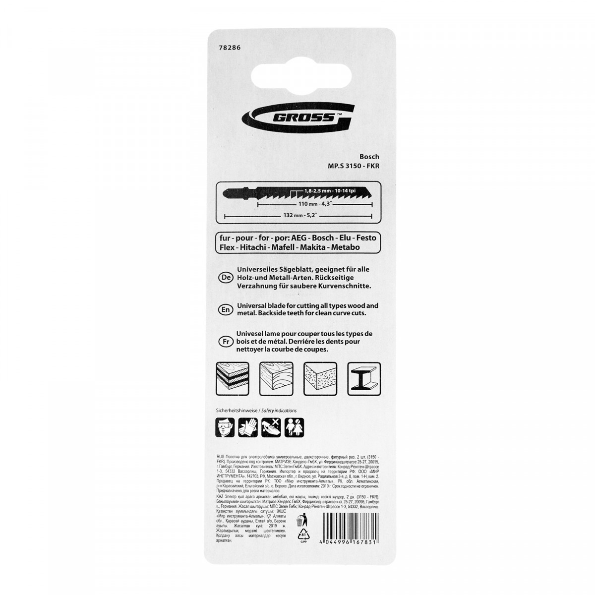 Универсальные двусторонние полотна Gross 78286, 2 шт. (3150 - FKR), предназначены для фигурного и чистого прямого реза под свободным углом. Позволяют работать практически с любым типом материалов: черным и цветным металлом, алюминиевым профилем и трубами толщиной 3-10 мм, оргстекла и пластмассы 3-100 мм, ламината, ДСП, древесины 5-100 мм, в том числе клееной. Полотна изготовлены из качественных материалов на высокотехнологичном производстве в Германии, поэтому рассчитаны на профессиональное использование.