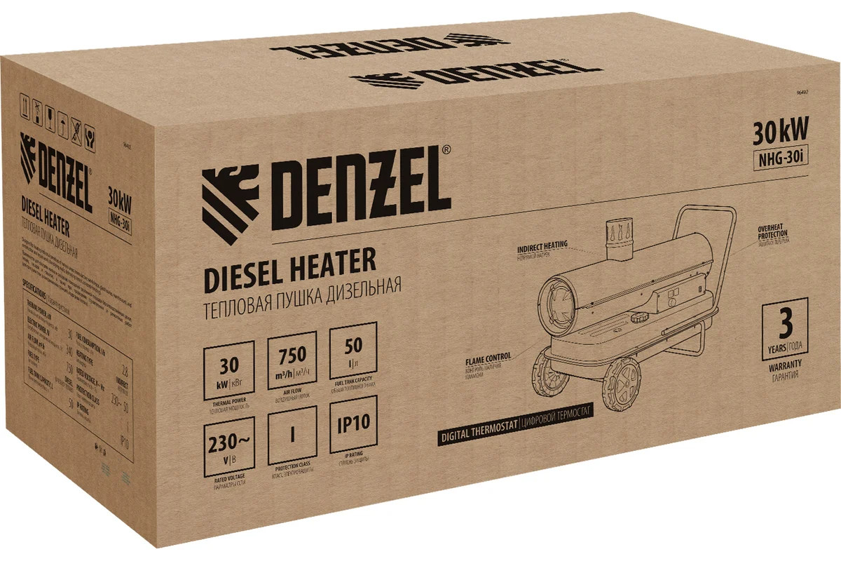 Дизельная тепловая пушка непрямого нагрева DENZEL NHG-30i 96492 с цифровым термостатом обладает тепловой мощностью 30 кВт и генерирует поток теплого воздуха 750 м3/ч.