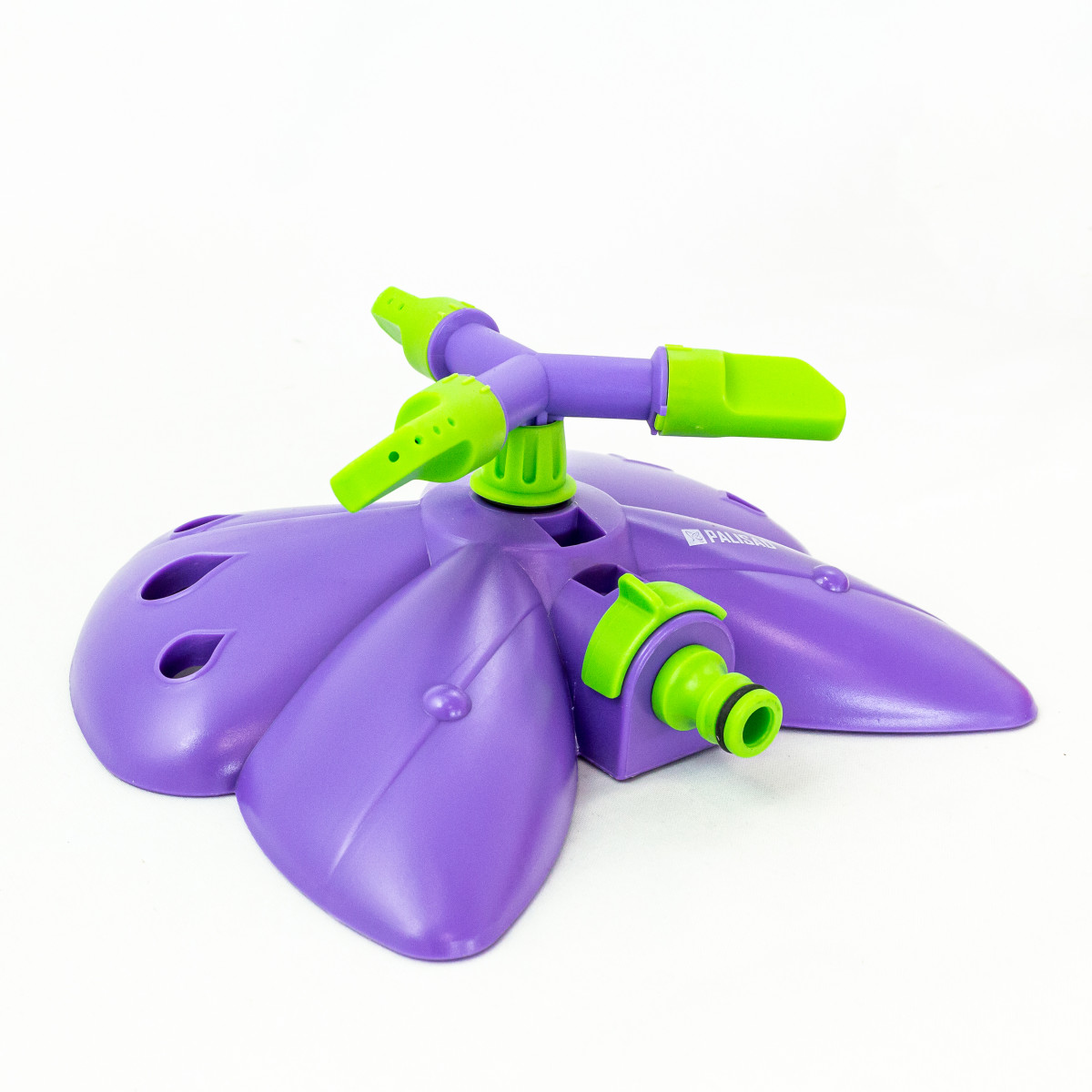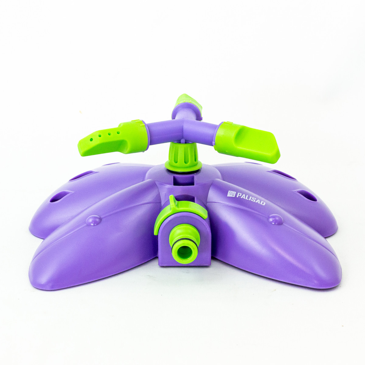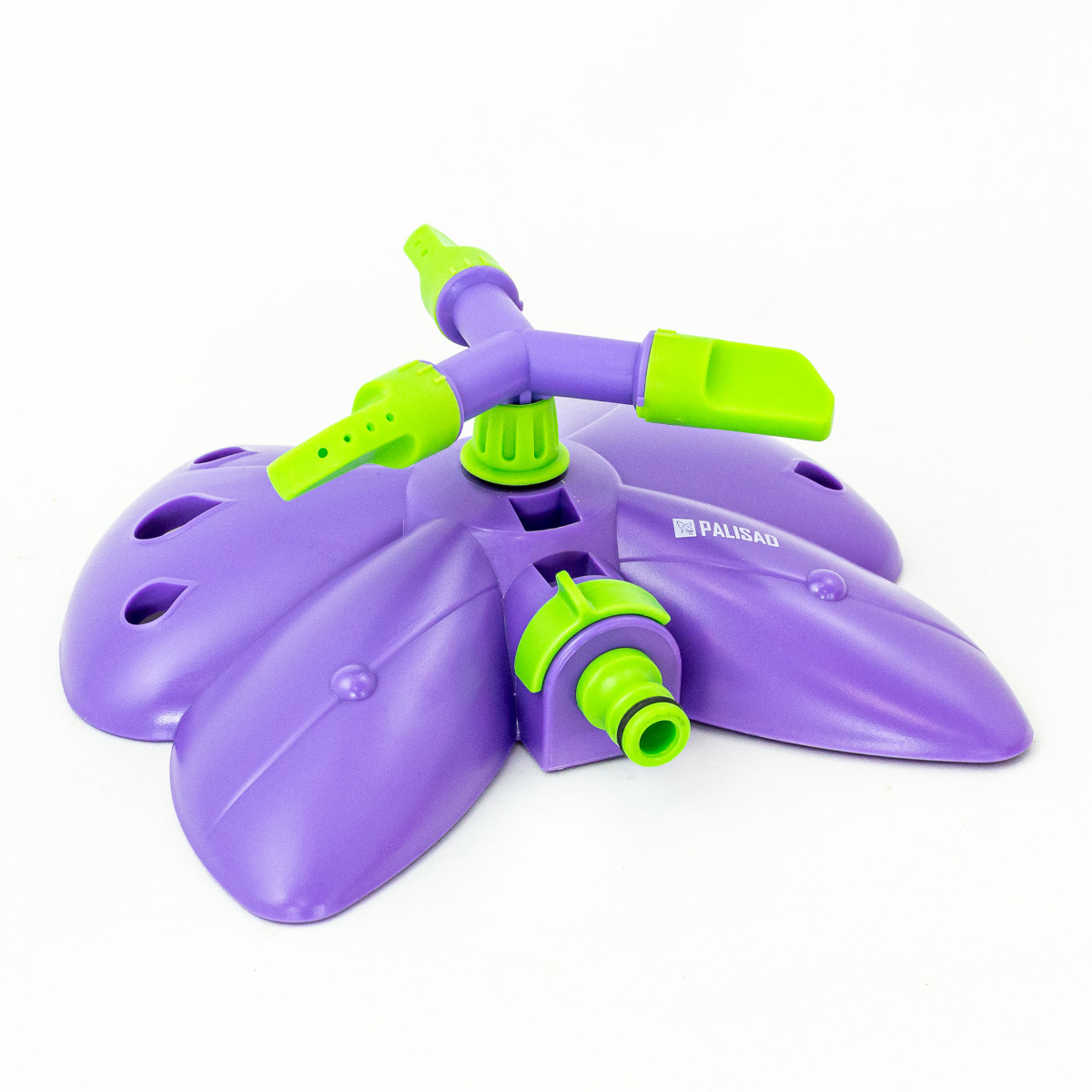 Вращающийся разбрызгиватель Palisad «Бабочка» с 3 лопастями, с регулировкой, используется для орошения газонов и садовых участков. Максимальная площадь полива составляет 58 кв.м. Дальность распыления можно варьировать от 2 до 4,3 м. На каждой лопасти 4 отверстия, обеспечивающие равномерный полив. Основание выполнено в форме бабочки, что придает устройству оригинальный вид.