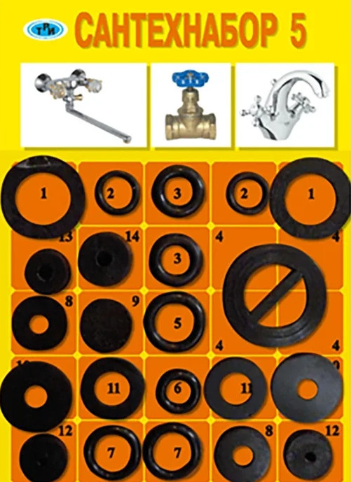 Универсальный набор, состоящий из колец, прокладок и клапанов, предназначенных для установки в отечественные и импортные смесители, вентили, гибкие подводки, кран-буксы различной модификации.