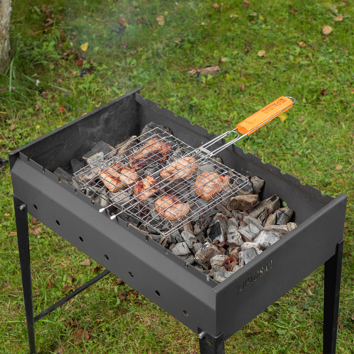- Решетка оборудована увеличенными опорными стержнями, за счет чего прочно фиксируется на мангале, а при готовке ее площадь используется полностью.