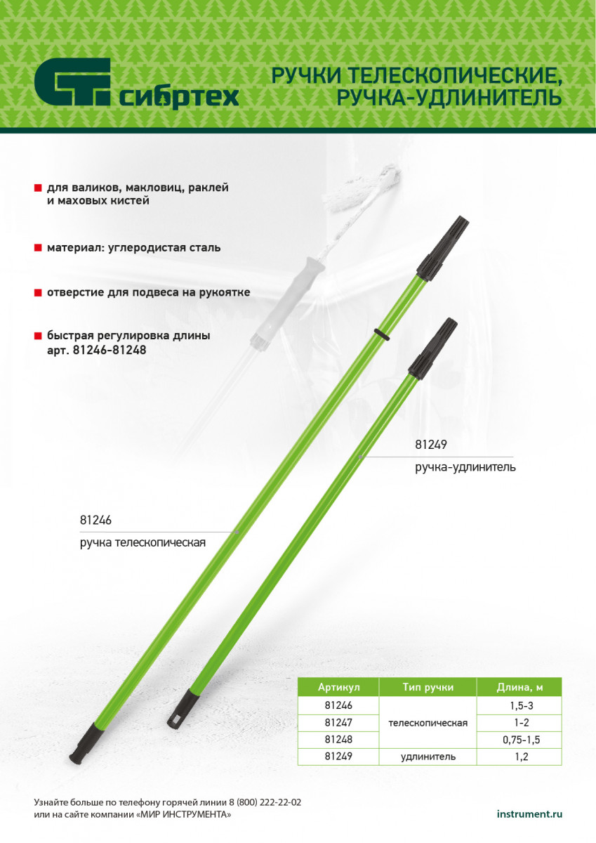 Телескопическая металлическая ручка Сибртех 81246 регулируется по длине в диапазоне 1,5-3 м и используется для проведения малярно-отделочных работ: окрашивания высоких стен и потолков, прокатки обоев. Совместима не только с валиками, но и с маховыми кистями, раклями и макловицами, что расширяет возможности ее применения.