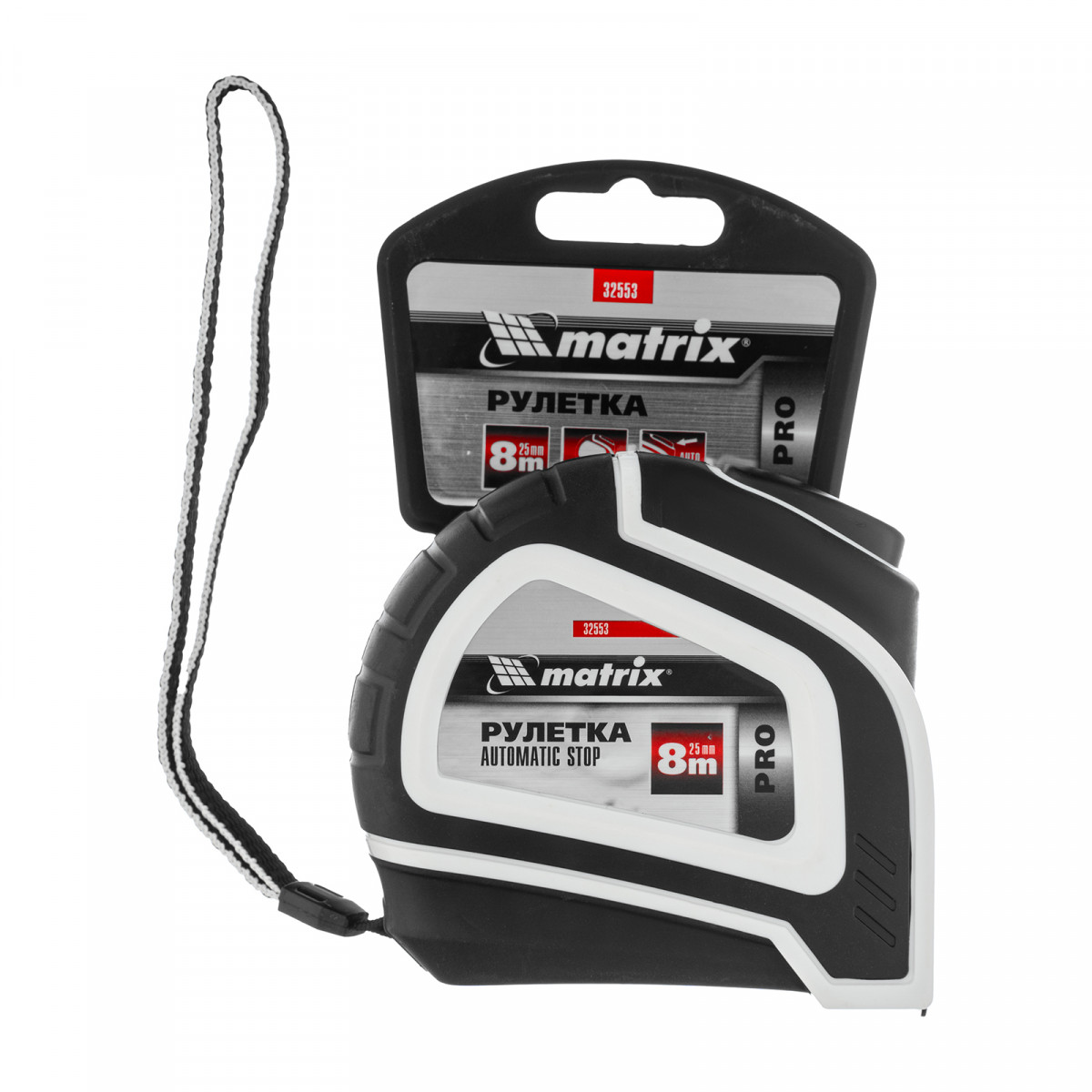 Рулетка Matrix PRO Autostop 32553 с полотном длиной 8 м и шириной 25 мм, в двухкомпонентном корпусе, с автоматической фиксацией ленты, используется для измерения объектов и расстояний. Корпус изготовлен из ударопрочного ABS-пластика, резиновые элементы увеличивают его сопротивляемость механическим нагрузкам. Заклепки надежно фиксируют зацеп на конце измерительного полотна. Рулетка подходит для профессионального и бытового применения.